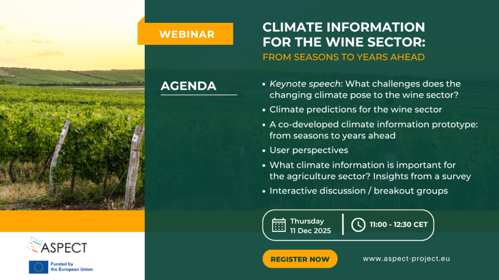 On Thursday 11 December, ASPECT is hosting a webinar titled “Climate information for the wine sector: from seasons to years ahead”. This session, held at 11:00-12:30 CET, will explore the challenges posed by a changing climate and how climate predictions can help the wine sector to adapt. During the webinar, we will take a deep dive into the prototype and indicators co-developed in the project. This will be followed by an interactive discussion where participants can share perspectives on the prototype and suggest improvements required to address their needs.